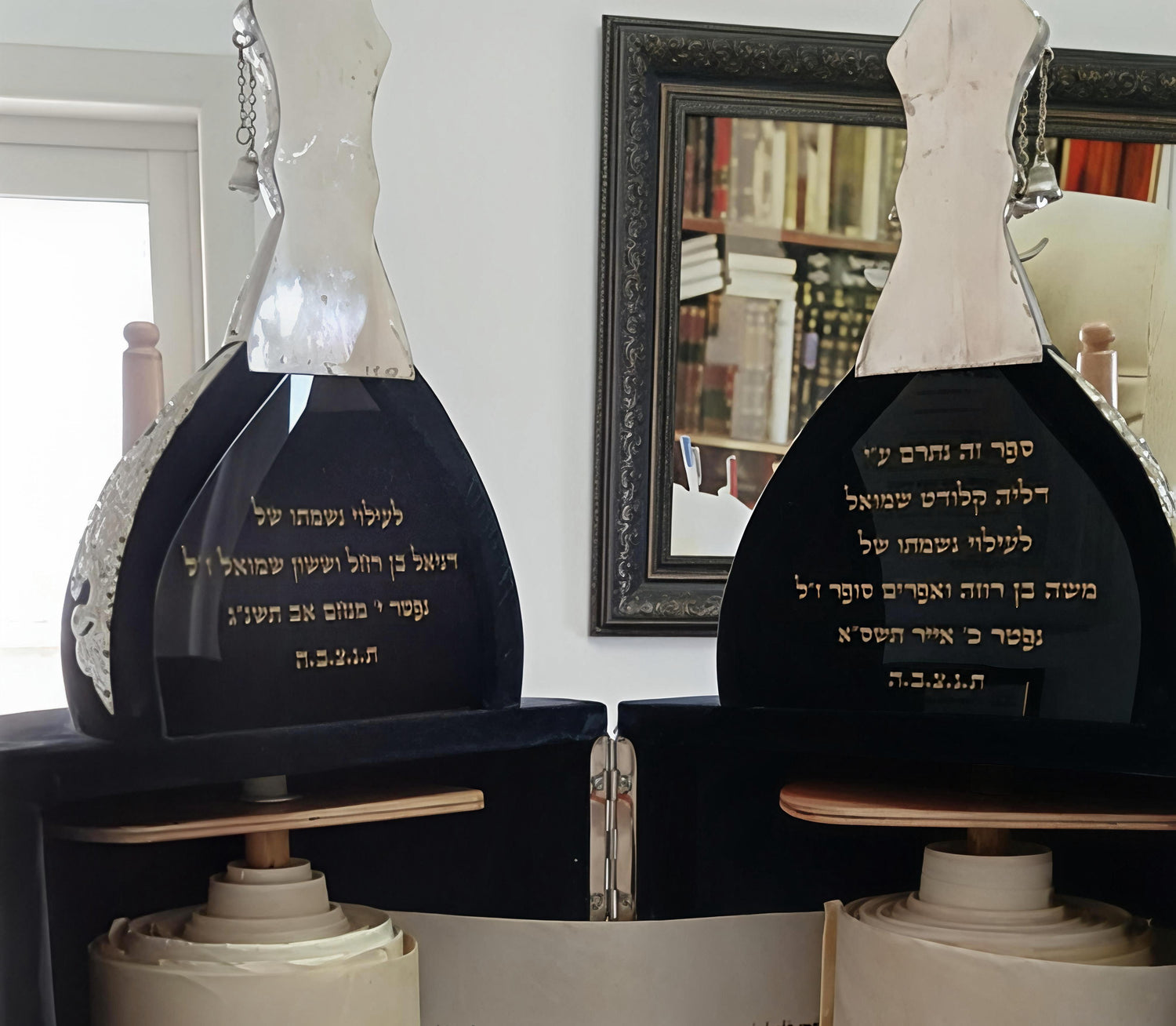 שילוט לספר תורה מזכוכית אקרילית מותאם לצורת הספר בייצור מיוחד ומדוייק.