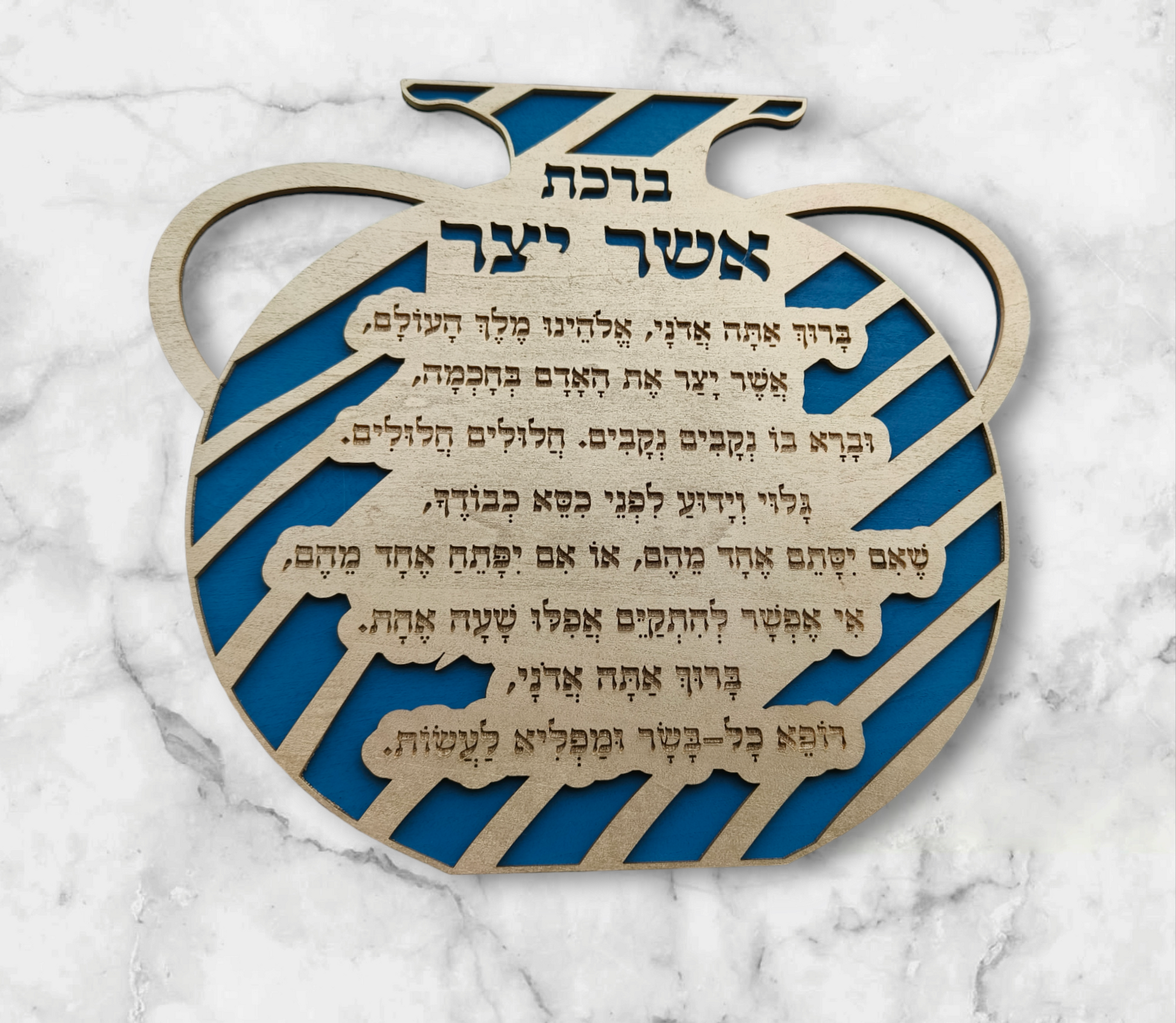 ברכת "אשר יצר" בעיצוב אמנותי של כד, עם רקע כחול מרהיב שמכניס שלווה וקדושה לכל פינה בבית.