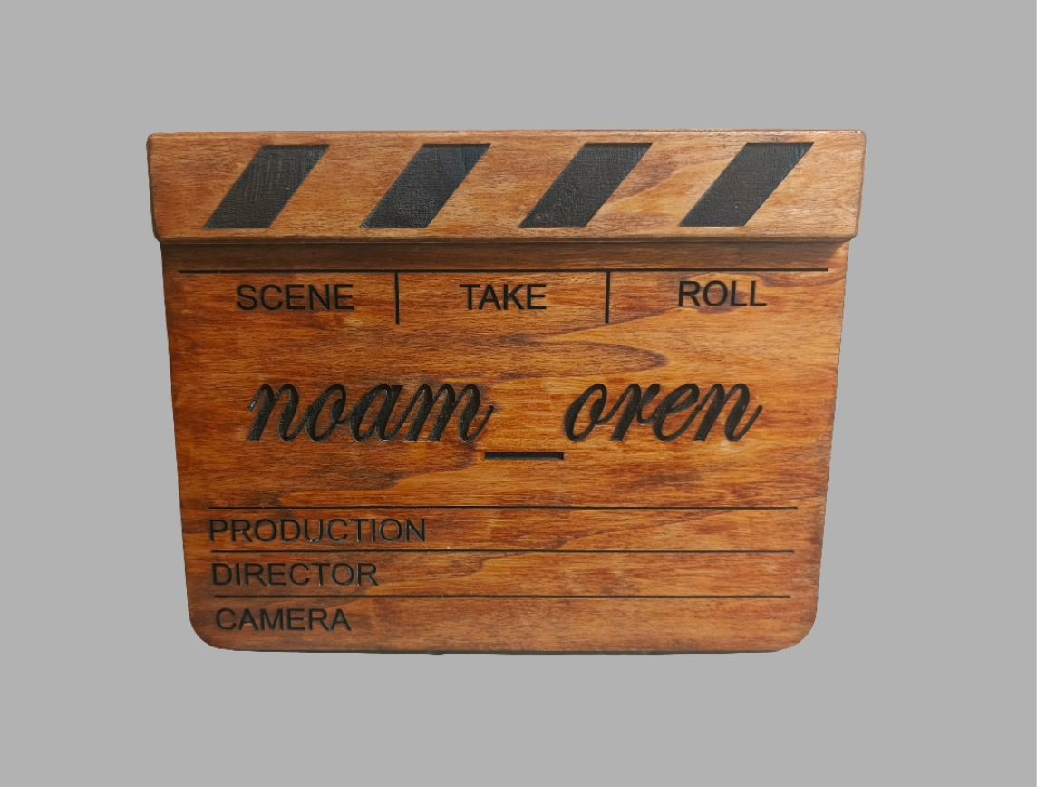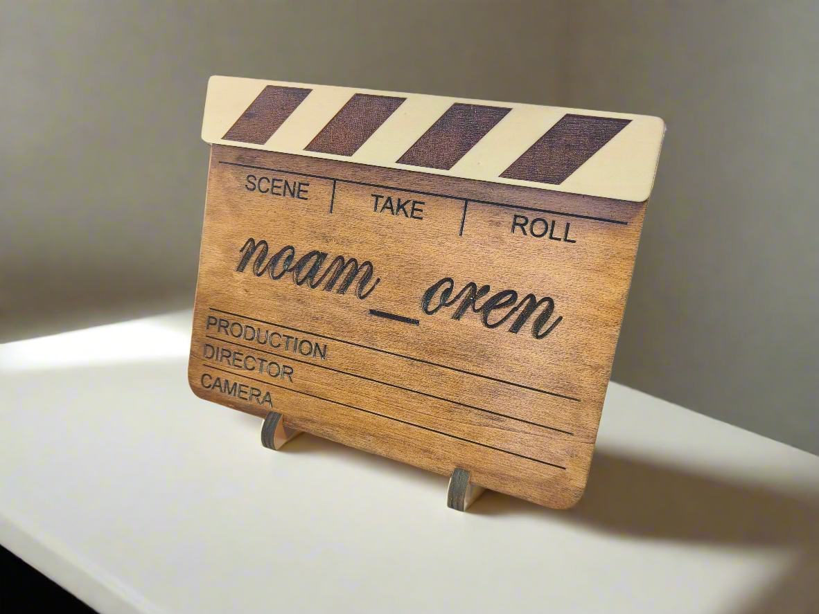 שלט "קאט" של במאים בחריטה מדויקת על עץ טבעי.