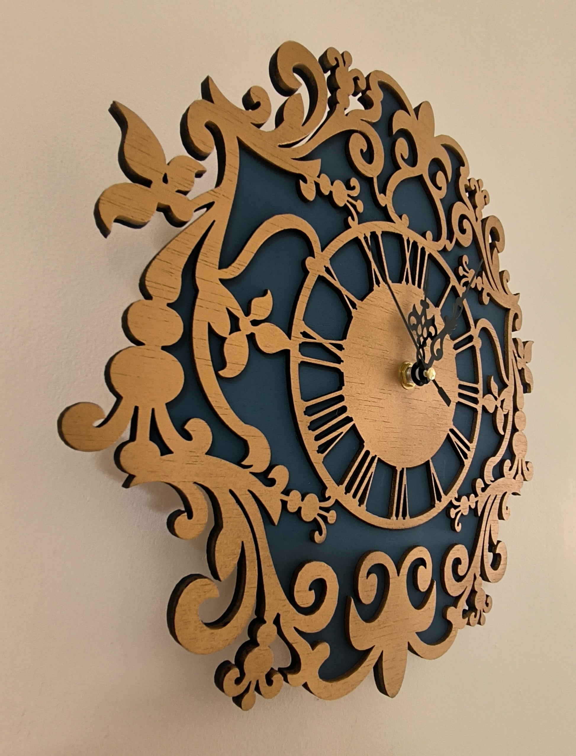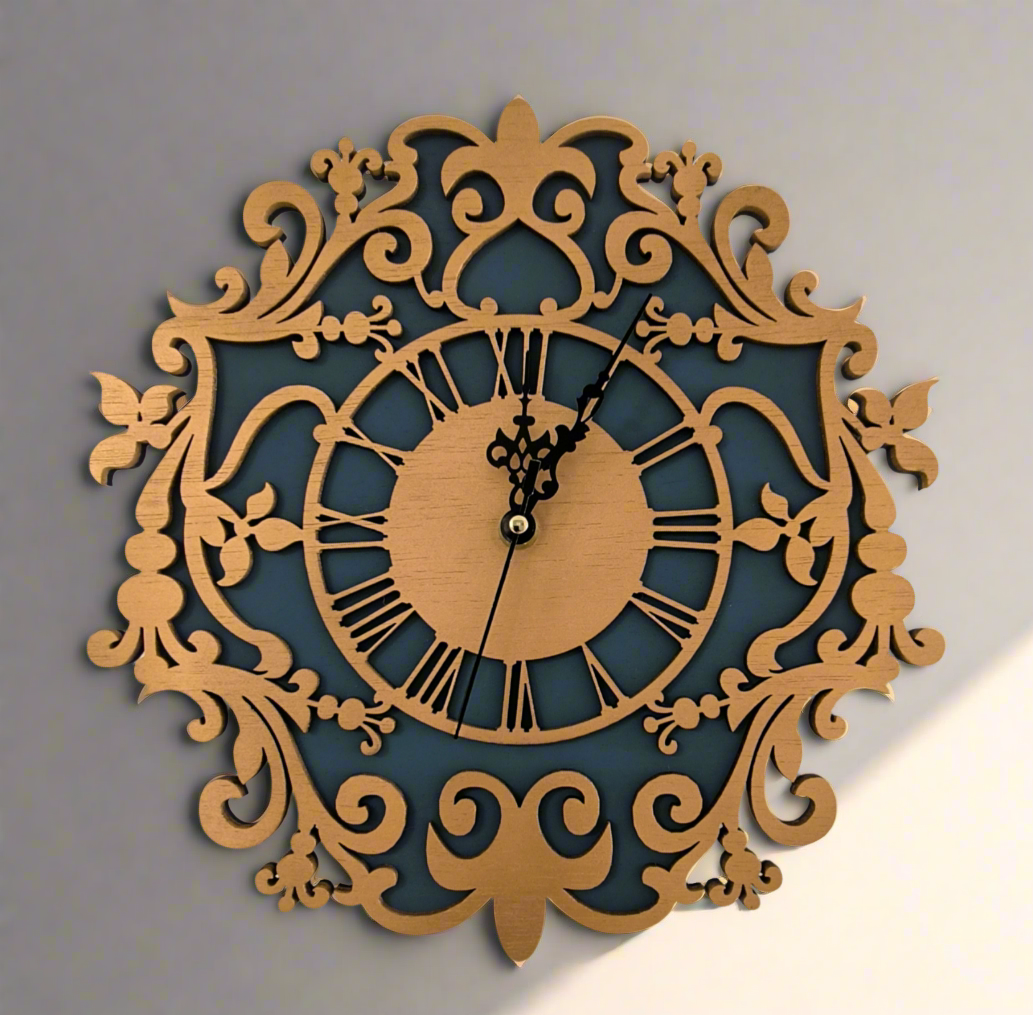שעון קיר אלגנטי ומרשים, עשוי מעץ עם שתי שכבות בצבעי זהב וכחול מלכותי.
